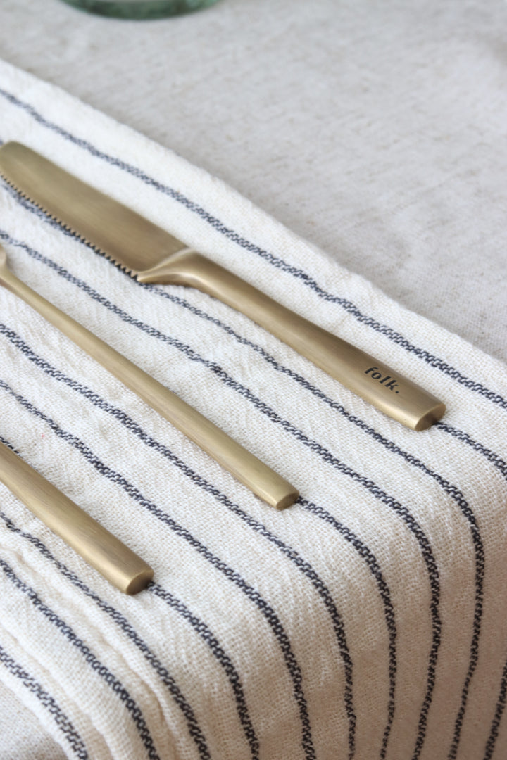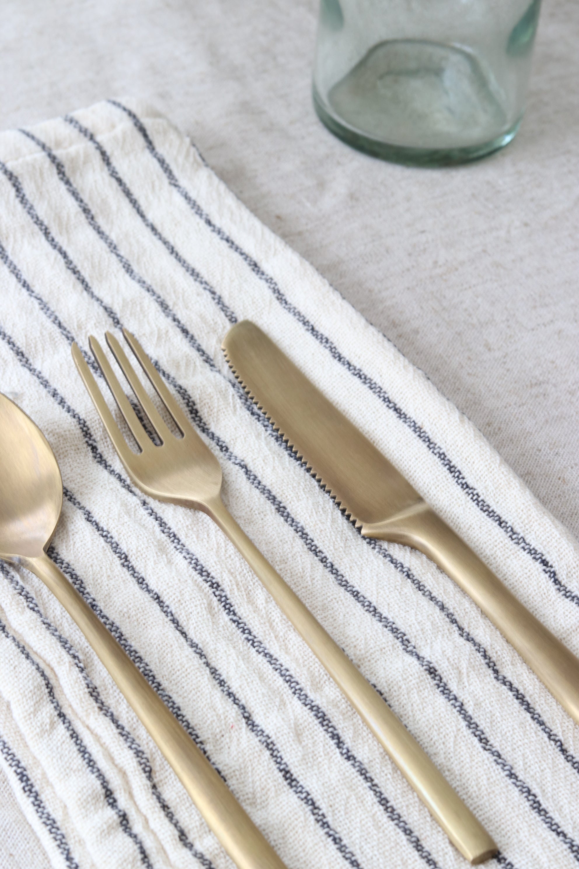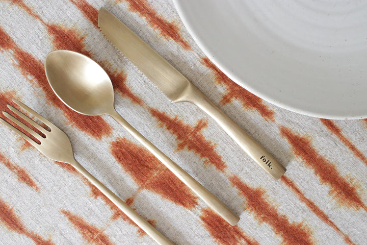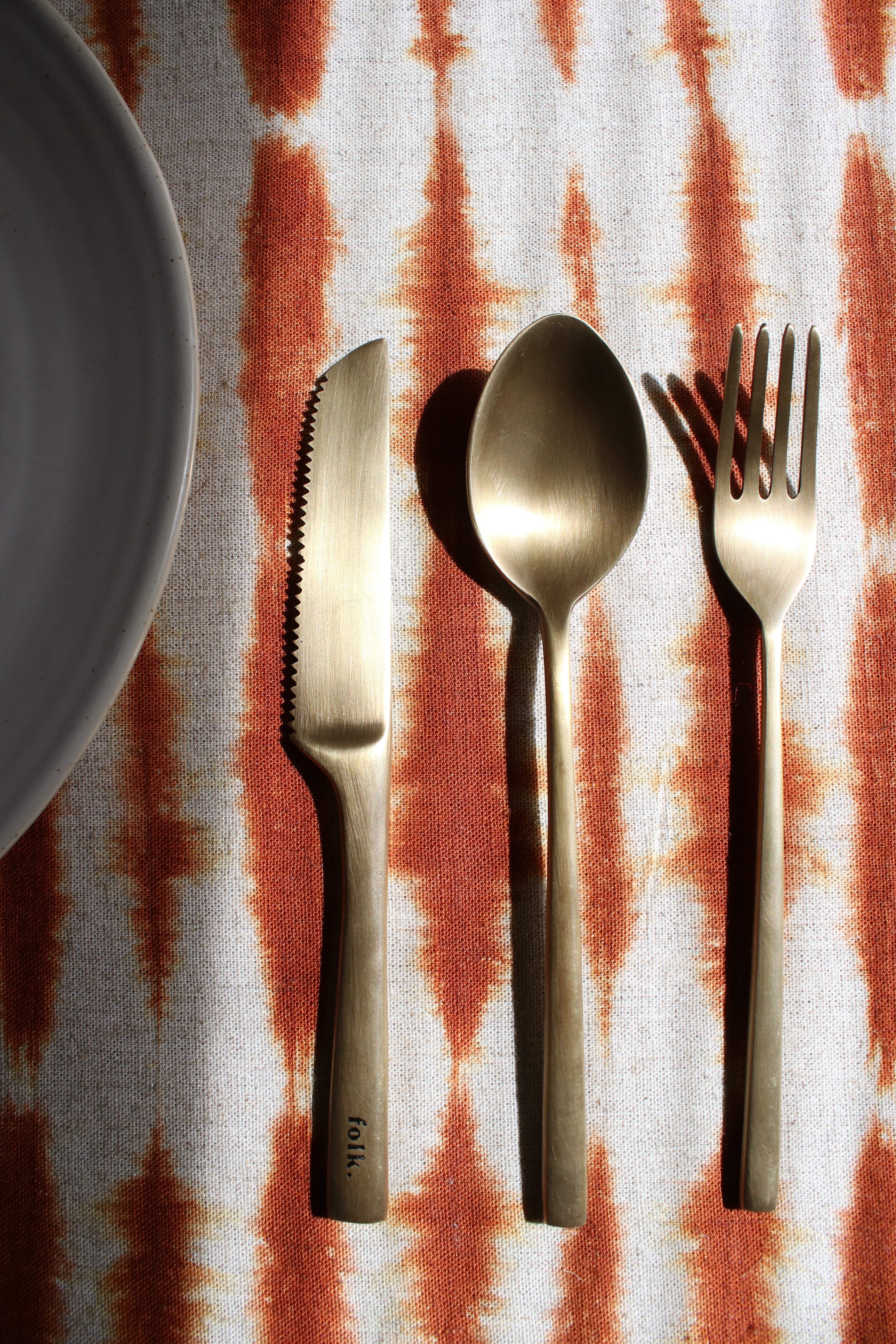 Each utensil in this collection is meticulously handmade, designed to stand the test of time and become a cherished part of your table setting. 100% brass flatware. Includes 15 pieces.