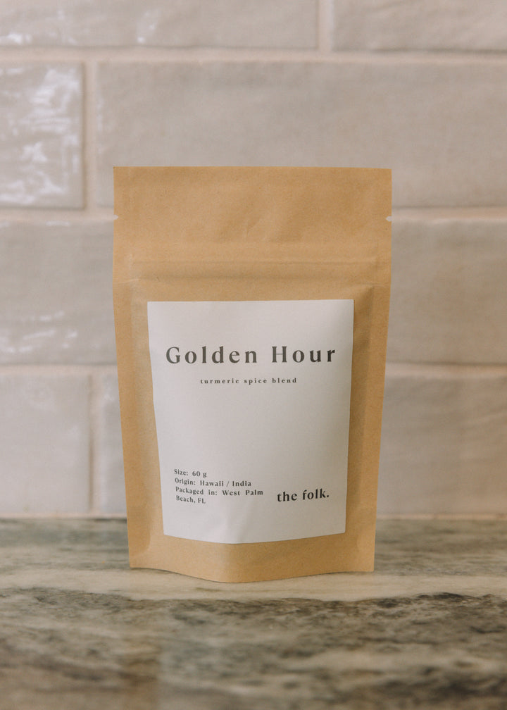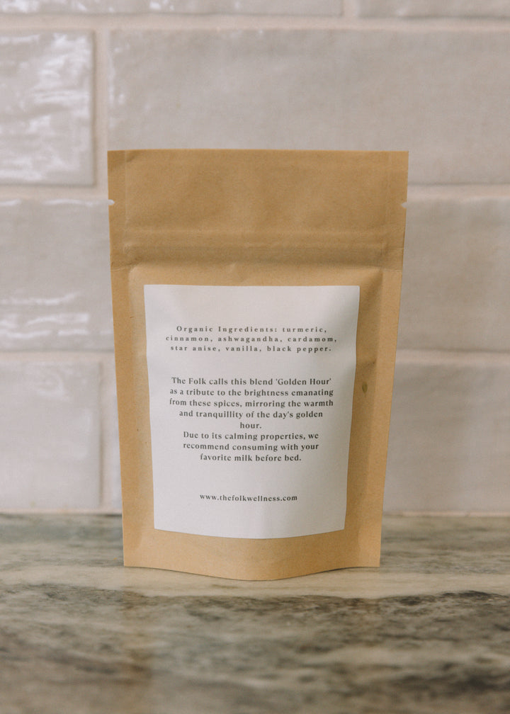 Golden Hour’ - a term that signifies that magical time just after sunrise or just before sunset, where the world is bathed in a warm, golden glow. It's a moment of serenity, of tranquility, and of harmony with nature. With our new wellness concoction, 'Golden Hour,' we aim to bottle up that sense of peace and warmth, providing you with a nourishing experience anytime you need it. Our 'Golden Hour' is a restorative botanical elixir, inspired by the ancient Ayurvedic tradition of haldi doodh, also known as golden milk. This aromatic blend is crafted with organic ingredients including Turmeric, a potent anti-inflammatory and antioxidant; Cinnamon, which aids digestion and boosts immunity; Orange, for a kick of vitamin C and antioxidants; Ginger, a powerful root that helps fight inflammation and supports digestion; Vanilla, adding a hint of natural sweetness and calmness; Cardamom, which soothes the digestive system; Star Anise, known for its antimicrobial and antioxidant properties; Ashwagandha, a revered adaptogen that helps manage stress; and a dash of Black Pepper to enhance the absorption of all these beneficial ingredients. Each ingredient has been thoughtfully chosen not just for its unique flavor profile, but for its healing properties as well. When combined, they create a delicious, warming brew that supports overall wellness and offers a moment of tranquility, just like the golden hour. Enjoy 'Golden Hour,' and let the warm, comforting spices nurture your body and mind, creating a sense of inner peace and rejuvenation. Because every hour should feel like the golden hour.